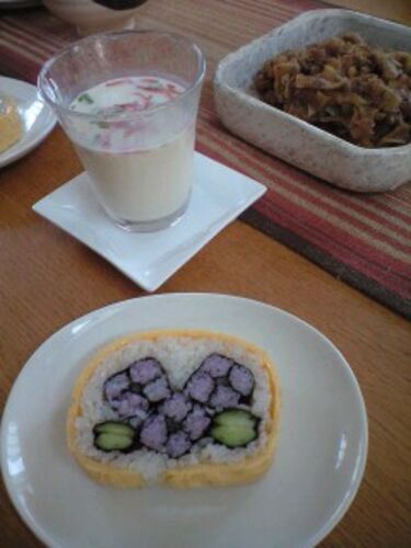 火曜日のお菓子教室のときの、Tさんのお料理です 梅雨時にふさわしい、紫陽花の房総寿司 美しいお寿司に、みんな大絶賛 お味も素晴らしくて、感動してしまいました~ Tさんは、紫陽花柄の三角巾に、紫陽花色のエプロン。 季節を楽しんでらっしゃいました …