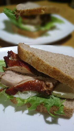今日の夕ご飯の一品… グラハムパンのサンドイッチです 間に、レタス、オニオンスライス、クリームチーズ、スモークチキン。。。 マスタード、黒コショウを効かせて。。。 いかがでしょう~? 夫も息子も、「美味しいよ~」というばかり~ それ以外の感想は~…