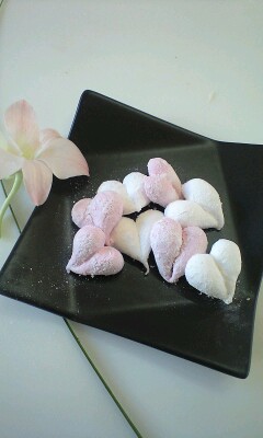 2008-12-03 ハートのマシュマロはフランボワーズの味☆ 洋菓子 #食べ物 ピンクと白のマシュマロを作ると、クリスマスに合うかしらと、ハートの形に作ってみました♪ マシュマロは、果物のピューレや抹茶など、様々いれられて、楽しいですね♪ 今回のフランボワーズは、酸味が爽やか、マシュマロは苦手とおっしゃる方も美味しいですね~とおっしゃってくださいます。 真っ白、プレーンなマシュマロの澄んだ味は、手作りでこそです。 クリスマスのかわいいプレゼントにいいですね☆