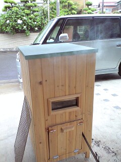 2009-05-28 燻製ボックス☆ 手作り素材 #食べ物 先週、いつもお世話になっている大工さんが、突然、燻製のための立派な箱を作って持って来てくれました☆ びっくり!感激! 素晴らしいんです! 私たちは、ずっと冷蔵庫や洗濯機のダンボール箱で燻製してきたんです… さすが、大工さんです! 外から見える窓があり、七輪を出し入れする扉あり。 七輪は車輪つきの板で出し入れ楽々! すごいです☆ 幸い、今日の千葉は長袖でちょうどよい涼しさ。 燻製するのにいい日です。 雨は降っていますが、屋根のあるガレージで、1日のんびりベーコン作り…♪ きっと、美味しいベーコンになることでしょう。 出来上がりが楽しみです♪