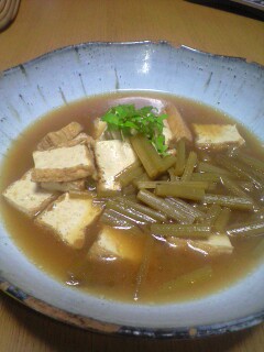 2010-05-20 夫の手料理…蕗と厚揚げの煮物♪ 夫の手料理 #食べ物 今年は僕が蕗を煮てみたいと、庭の蕗の収穫(草取り!?)をした夫… 塩で板ずりし、ゆでて、皮むきして。 丁寧に頑張っていました☆ さて、どう煮ようかな。 ずいぶん考えていたようですが、ネットで調べて、厚揚げと一緒に薄味で煮あげました! では、ちょっとお味見させてくださいね♪ 美味しい! そもそも料理に興味のある夫。 少しずつ、腕をあげているみたい…! 美味しい夕ご飯になりそうです♪