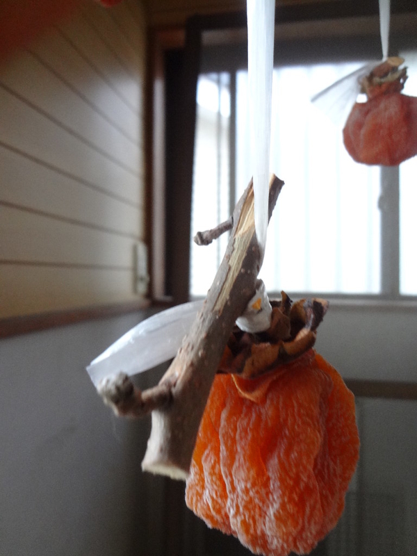 これは、枝についたまま、皮をむき、干し柿にしたものです。