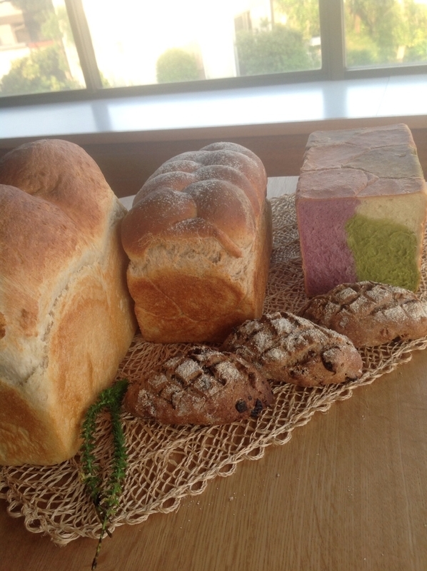 全粒粉の風味が生きた香ばしい全粒粉パン と 抹茶、むらさき芋、プレーンの三色パンをセットにしました。