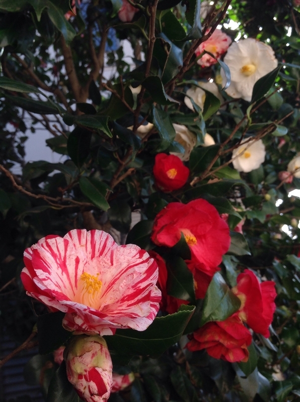 一本の椿に、色々な色の花が咲いています。